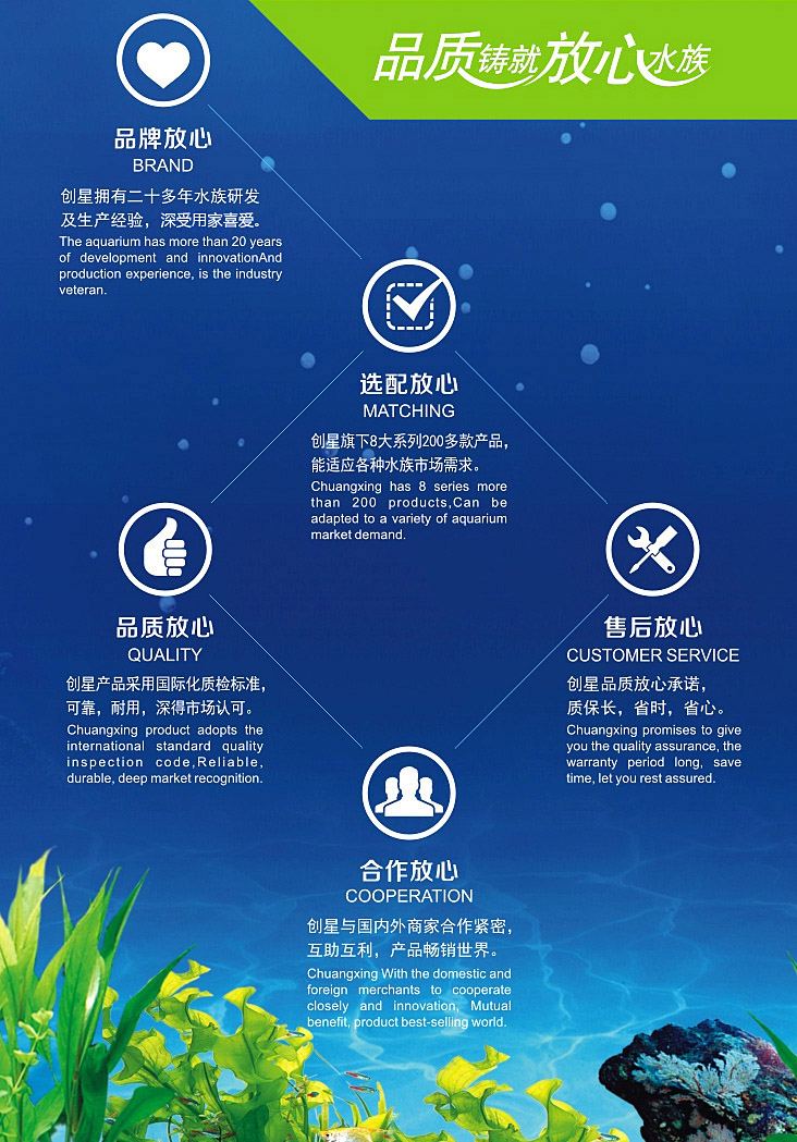 為讓市場(chǎng)更了解創(chuàng )星核心價(jià)值觀(guān),我們重塑了新的廣告語(yǔ):“品質(zhì)鑄就放心水族”。
